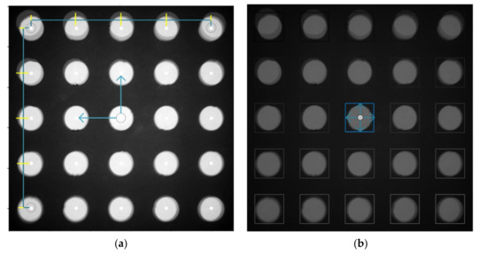 The four images obtained for each solution were combined into a single image based on information obtained during the calibration of each quadrant. The quadrant image identifies the tube in its unique circle position in each quadrant and rotates the image through the angle of rotation. After rotation, images are cut to the same size, and positioned in the center of the tube in quadrant to fit one image. Figure 6 shows the process of extracting brightness after image matching. Figure 6a shows the center position of each tube in a 5 × 5 array marked with a white dot. By using the bilinear interpolation method through the centers of the four corner tubes, the positions of the centers of the remaining tubes can be found. Since the image distortion of the proposed system is very small, it can be assumed that the interval obtained by dividing the width and height from the centers of the corner tube into quarters is the same as the tube spacing. The blue rectangles in Figure 6b show the ROI (region of interest) of each tube. Since the tube, ROI and center may become misaligned for each experiment, a brightness average was obtained in a square area that was significantly smaller than the tube diameter, such that the area in which to obtain the average brightness was always located in the tube. In this study, the size of the entire ROI area was 161 × 161, and the square area to obtain the average brightness was set to 80 pixels per side.