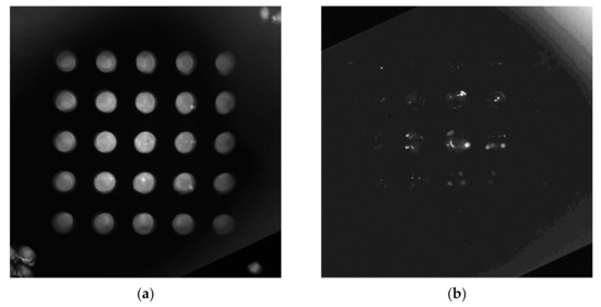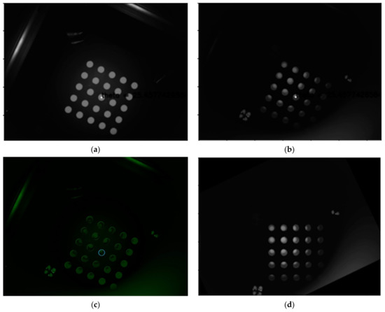 Figure 9a is a second quadrant image taken using a mask sheet, and Figure 9b is a second quadrant image taken of a tube containing a FAM reagent. Figure 9c illustrates the difference between the mask sheet and the fam solution by combining them. When the position of the diameter of the circle at the center of the 5 × 5 tube was marked, the distances between the tubes comprised fewer than 1.5 pixels. Therefore, it was found that there was no problem in using the image rotation center and rotation angle calculated by the mask sheet. Figure 9d shows the image rotated by the rotation center and rotation angle obtained with the mask sheet in the FAM image of (b). This image also showed that the calibration was stable.