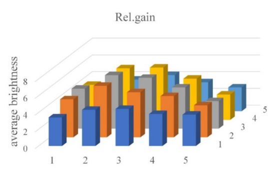 The average brightness of the tube image containing DDW was about 12. The average brightness of the tube image containing FAM was generally 55 or higher. Figure 13 shows the relative gain difference between the FAM and the DDW images. In fluorescence detection, brightness through relative gain is based on tubes in the same location in each well, i.e., it is the value obtained by dividing the brightness of the DDW image by the difference between the brightness of FAM and DDW images. It is generally more than 2.84, as shown in Table 3. Table 3 shows the average brightness and relative gain of tubes containing FAM and DDW.