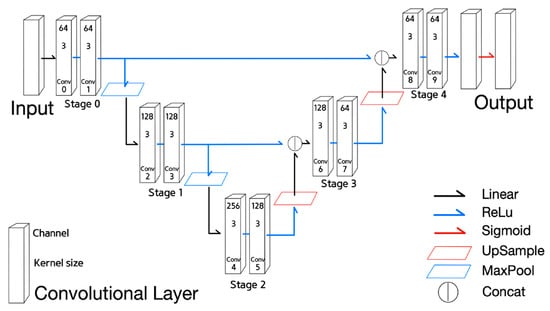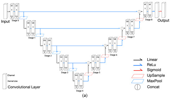 - Equations (7)–(9) are defined similarly to Equations (4)–(6) of U-net, respectively. However, Equation (8) is for the encoder stage corresponding to the 1st or the 2nd stage and Equation (9) for the decoder stage corresponding to the 3rd and the 4th stage.