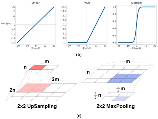 U-net and operations. (a) The architecture of U-net. (b) Graphs of linear, ReLU, and sigmoid activation functions. (c) Processes of upsampling and maxpooling.