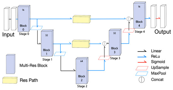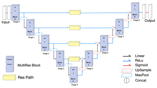 The third NN used for the experiment was the MultiResUNet [18], as shown in Figure 3. Each stage in U-net was replaced with a MultiRes block, and each skip connection was replaced with a residual path. The MultiRes block and the residual path illustrated in Figure 4 contain residual connections.