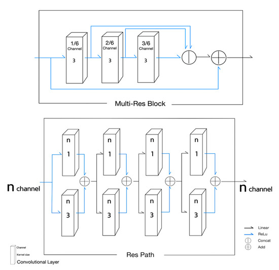 - The Equations (10)–(12) correspond to the 1st, the 2nd, and the 3rd convolutional block of the MultiRes Block illustrated in Figure 4. The term in Equations (10)–(12) means the number of channels in an input ;