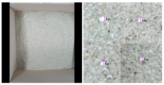 Our dataset consisted of photos of sand, mixed with microplastic particles. The original size of the photos is 1440 × 1440, as shown in the left photo of Figure 7. However, the size of the photos in the dataset was 512 × 512. These were generated by cropping the original photo into 512 × 512 images with 100 pixel boundaries, overlapped with adjacent photos. The size of a foreground object, that is, microplastic, is usually 3–10 pixels, as shown in the right photo of Figure 7.