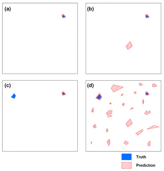Hypothetical prediction result. (a) The best result. (b) The result showing insufficient precision. (c) The result showing insufficient recall. (d) The result showing excessively low precision.
