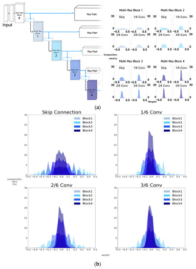 Weight histograms of MultiRes blocks of MultiResUNet. (a) Weight histograms of layers within MultiRes blocks 1, 2, 3, and 4. (b) Overlapped weight histograms for each component of MultiRes blocks 1, 2, 3, and 4.