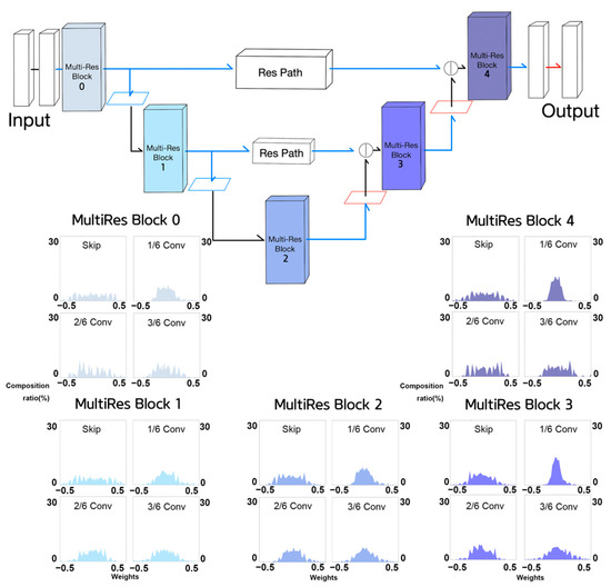 Figure 13 shows the weight histograms of each component of the MultiRes blocks of Half MultiResUNet. Kernel weights are generally widely distributed over a given range. In other words, most components of the MultiRes blocks appeared to be involved in feature learning. This may have contributed to the leading segment performance of Half MultiResUNet, among the five NNs. Some components of MultiRes blocks 3 and 4 display weight distributions centered around zero. Hence, we performed experiments using Quarter MultiResUNet.