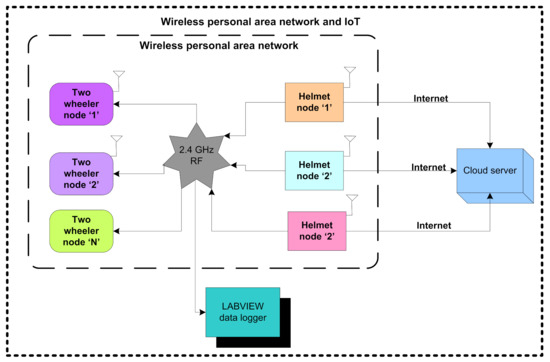 The helmet node also confirms to the two-wheeler node that the person is wearing the helmet through 2.4 GHz communication. The receiver unit of the two-wheeler node receives the confirmation through 2.4 GHz communication and activates an RFID reader embedded in the two-wheeler node to confirm the authentication of the person. After the completion of the authentication, the two-wheeler node ignites the two-wheeler and sends the information about the ignition to the helmet node. The node MCU embedded with the helmet node logs the sensory information, authentication, and ignition to the cloud server, and also sends to the LABVIEW data logger through 2.4 GHz communication.