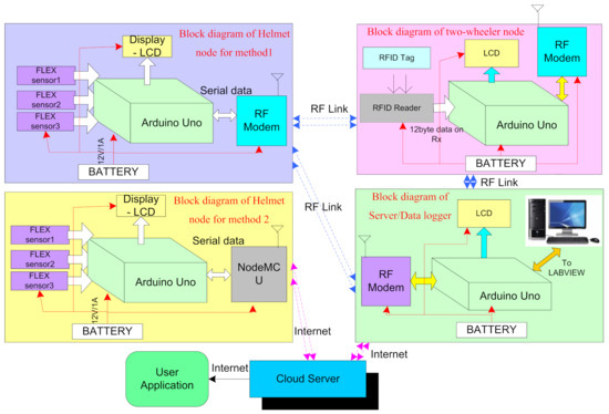The system is developed in three sections, namely, the helmet node, the two-wheeler node, and the server/data logger as shown in Figure 2. The helmet node (transmitter section) comprises of three flex sensors, a controller unit, a power supply (rechargeable battery), a serial port (to charge the battery), and an RF modem. The two-wheeler node (receiver section) comprises of an RF modem, controller unit, RFID reader (to authentic the user), battery, and relay (to ignite the vehicle). The server/datalogger comprises of an RF modem, controller unit, power supply (battery), and USB to a serial port (to interface with PC/LabVIEW).