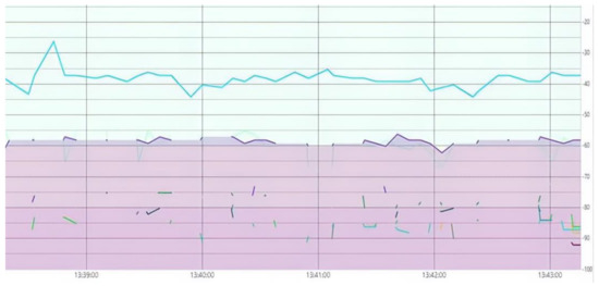 In the industrial scientific and medical (ISM) band, the following wireless technologies namely Bluetooth, Wi-Fi, and Zigbee are operated on a 2.4 GHz frequency band. The interference of these wireless technologies is tested by using a radiofrequency Received Signal Strength Indicator (RSSI), and channel state information (CSI) techniques [38]. A received signal strength indicator (RSSI) is utilized for testing the interference of radio frequency signals of same frequency band i.e., 2.4 GHz [39]. In RSSI, the coarse-grained activity recognition is achieved as it falls in the time domain. The interference test is carried out by considering the RSSI of the various devices on the same frequency spectrum. Furthermore, the device indicted to have the lowest RSSI (closer to 0 dB), and thus the other interference in that spectrum is not subjected to overlap with our signal or message, as shown in Figure 3, where the blue signal represents the RSSI of our concerned device and the other signal interference is represented in the violet color.
