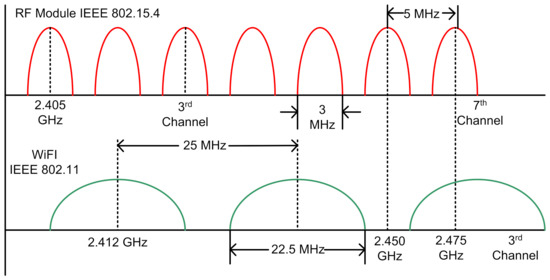 Moreover, as shown in Figure 4, the plot shows the spectrums of corresponding Wi-Fi and 2.4 GHz RF. As both the Wi-Fi and 2.4 GHz-based Zigbee RF works through spread spectrum transceiver methodology where they never continue to operate on the same radio channel indefinitely. Furthermore, they tend to occupy the bands of frequencies being the center frequency band as the reference to the radio channel assignment. Wi-Fi occupies a considerably large band channel thereby occupying more RF spectrum per channel than RF. The channel space between these allows them to coexist without interfering.