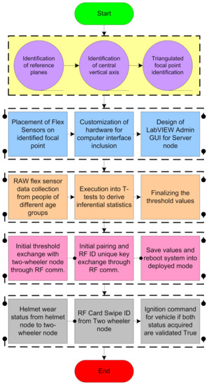 The statistical data received during the experiment is utilized for deciding the appropriate threshold value for igniting the two-wheelers. The threshold value is confirmed by applying the t-test hypothesis. The threshold value obtained after the t-test is logged in the helmet node for initiating the communication with the two-wheeler node. The pairing of the helmet node along with the RFID key is achieved through 2.4 GHZ RF communication. During real-time implementation, the helmet node updates its status to the server and the LABVIEW datalogger after the helmet is worn. Ignition is command for the vehicle if both statuses acquired are validated to be true. In the following section, the explanation of the reading and placement of flex sensors along with the RFID code extraction is discussed.