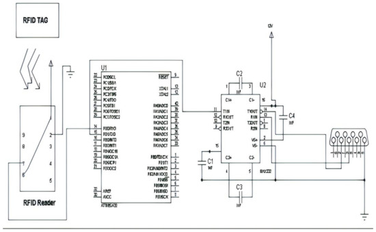 Connect pins no. 2 and 3 of the DB9 connector to pins 14 (R2-IN) and 13 (T2-OUT) of MAX232 IC, respectively. Connect pin 11(T2-IN) of MAX232 to 15 (TX) of Atmega32. Connect a capacitor between 1 and 3 of MAX232 where (+) the terminal of the capacitor is connected to pin no. 1 and 3 with the (−) terminal of the capacitor. Connect a capacitor between 4 and 5 of MAX232 where the (+) terminal of the capacitor is connected to pin no. 4 and 5 with the (−) terminal of the capacitor. Connect a capacitor between 2 and 16 of MAX232 where the (+) terminal of the capacitor is connected to pin no. 2 and 16 with the (−) terminal of the capacitor. Connect a capacitor between 6 and 15 of MAX232 where the (+) terminal of the capacitor is connected to pin no. 6 and 15 with the (−) terminal of the capacitor. Connect pin no. 7 (data) of RFID to pin no. 14(RX) of Atmega32. Connect pins 1 and 6 of RFID to Vcc(+5 V) and pin no. 2 to Ground.