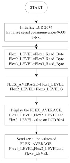 Figure 9 shows the flow diagram of the helmet node. The functions for LCD and serial communication are initialized. After the initialization, the system will wait for the signals from three flex sensors placed in the helmet. The average value of the three sensor outputs is taken, which is displayed on the LCD for experiment purposes and sent to the two-wheeler node through serial communication at a baud rate of 9600 bps. To send data on the cloud server node, MCU is connected to Arduino UNO and receives the data on www.thingspeak.com (accessed on 11 October 2021).