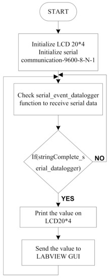 Figure 11 shows the flow chart for the LabVIEW GUI program. The functions for LCD and serial communication are initialized. Then, a check is performed for the serial events to receive data, if a complete string is received then it will be printed on the LCD and sent to the LabVIEW GUI, otherwise the system will again check for valid serial data.