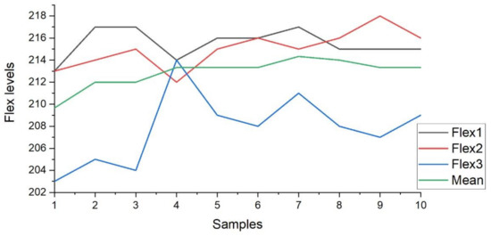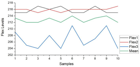 Furthermore, the Figure 12 presents the plot of the flex1, flex2, and flex3 sensors for the ten samples. The sample variation in the output level for February 2020 is visible in the plot. Figure 12 also describes the mean (green line in plot) of the three flex sensor values obtained from the ten samples.