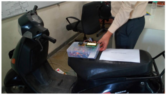 The proposed system is designed and developed for implementation in the real-time scenario to evaluate the performance. The helmet node based on 2.4 GHz RF communication embedded in the helmet is shown in Figure 14a. The components are assembled and, with the help of LabVIEW GUI, the threshold value is analyzed and set in the system. The developed helmet node and two-wheeler node are integrated into the two-wheeler as shown in Figure 15. The helmet node will be worn by the individual and the two-wheeler node is integrated into the ignition of the two-wheeler.