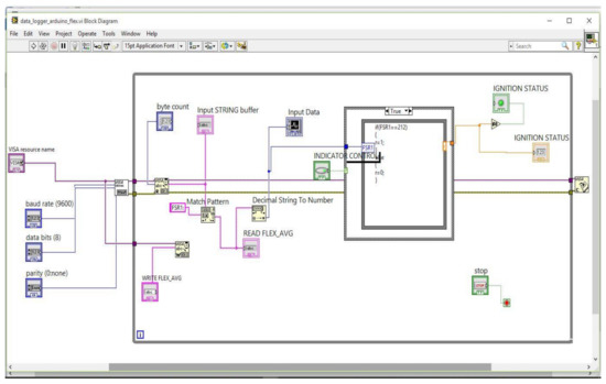 Figure 16 shows the block diagram for the LabVIEW GUI designed to analyze the working of the system. Figure 17 presents the front panel of the LabVIEW GUI, where the two types of input indicator control loops are written in programming in such a way that if both the signals are matched with pre-defined values then the indictor shows green, otherwise red. Here, the green indicator signifies the ignition of the vehicle, and the red signifies that the vehicle is not ignited.