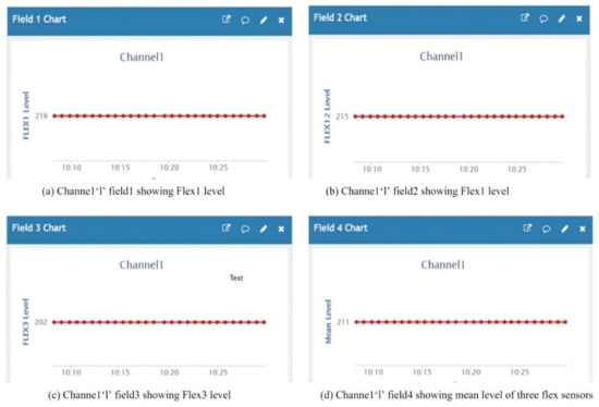 Data analysis is done for each flex output and the mean values in terms of level and voltage w.r.t time. Figure 18a shows the flex 1 level as ‘216’ at field 1 of the channel ‘1’ chart and Figure 18b the flex 2 level as ‘215’ at field 2 of the channel ‘1’ chart. Figure 18c shows the flex 2 level as ‘202’ at field 2 of the channel ‘1’ chart, and Figure 18d shows the flex 2 level as ‘211 ’at field the 2 of channel ‘1’ chart. Figure 19a shows the voltage output (mV) of flex 1 as ‘1054’ at field 5 of the channel ‘1’ chart and Figure 19b shows the voltage output (mV) of flex 2 as ‘1049’ at field 6 of the channel ‘1’ chart. Figure 19c shows the voltage output (mV) of flex 3 as ‘986’ at field 7 of the channel ‘1’ chart and Figure 19d shows the mean voltage output (mV) of all three flex sensors as ‘1035’ at field 8 of the channel ‘1’ chart.