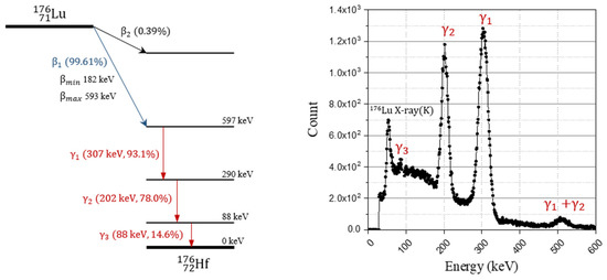 There has been considerable interest in inorganic scintillators based on lutetium, such as lutetium oxyorthosilicate (LSO) and lutetium yttrium oxyorthosilicate (LYSO), for use in positron emission tomography (PET) due to their favorable physical properties including high detection efficiency (≈0.86 cm−1, linear attenuation coefficient at 511 keV), fast decay time (≈40 ns), and high light yield (≈80% NaI (Tl)) [1,2]. Despite their advantages, lutetium-based scintillators could face issues in single transmission measurement, low sensitivity imaging, and wide energy window-scanning because of the natural occurring radioisotope of 176Lu that is contained in natural lutetium [3,4,5]. As shown in Figure 1, 176Lu undergoes decay and emits a beta particle with a mean and maximum energy of 182 and 593 keV, and a cascade of gamma rays or internal conversion electrons with energies of 307, 202, and 88 keV [6]. The intrinsic radiation of 176Lu (IRL) could create background noise in apparatuses as a uniformly distributed radiation source in scintillation crystals.