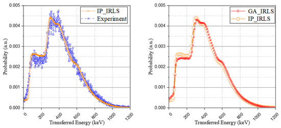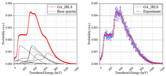 In addition to the approach of the optimization problem using the genetic algorithm, another method using relative intensity calculation with a Monte Carlo simulation to derive the possibility of the occurrence of each case was used to generate the IRL spectrum. The interaction probability and the escape probability of each radiation according to the isomer transition phase were taken into account (the results were set out in Table 5), and the method also used the same base spectrum as used in the optimization method and normalized it to have an identical area. As shown in Figure 7, although the retrospective method using the genetic algorithm provides a more detailed spectrum than the relative intensity calculation approach, both methods have good agreement with the experimental spectrum.