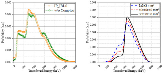 A comparison of the method without the Compton model, as proposed from previous studies, was performed. For this, the based spectra of Figure 5 and the weight coefficient derived from the interaction probability calculation were used to generate the IRL spectrum. Although a general agreement was achieved with both spectra, showing similar trends, as depicted in Figure 8 (left), there was a difference in the peaks of the spectrum. This is because, as shown in Figure 8 (right), the previous method that considers all the interactions from the isomer transition, including gamma ray emission or internal conversion as a total energy peak, overestimates the peak intensity when the scintillator structure becomes smaller.