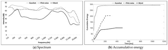 Three stimuli were compared in the current study: the Hebrew word ‘esh’ (fire) spoken by a male speaker, pink noise, and a single M16 assault rifle shot recorded at a distance of 200 feet (60.96 m) from the shooter. The word was recorded in a sound-treated booth, using an Electro-Voice™ RE320 microphone connected to a Focusrite™ Saffire Pro™ 24 DSP sound card, with a Hewlett Packard® computer running MAGIX® Samplitude® Pro X software. The M16 assault rifle shot was recorded by Sintonizar Productions [35]. Pink noise was generated using the Sound Forge™ Pro version 11 software of MAGIX®. The duration of the three stimuli was 409 ms for the word, 212 ms for the pink noise, and 202 ms for the gunshot with an additional reverberation tail of 800 ms. For determining the spectrum of each stimulus in the listener’s ear, a GRAS™ 45CB Acoustic Test Fixture (ATF) was placed in the same setting as the head of the listener in the experiment. Stimuli administered from the speaker at an azimuth of 0° were recorded and analyzed using SINUS™ SAMURAI™ version 3.0.2® software. The data are presented in Figure 1a, with the word having the narrowest spectrum and pink noise the widest. Figure 1b presents the accumulative energy for each stimulus, with the word having the least accumulated energy over time, and the gunshot the most.
