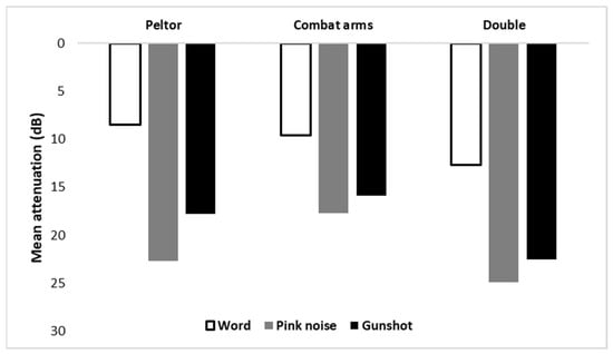 Mean attenuation of word, pink noise, and gunshot by HPD condition (Combat Arms™ earplugs, Peltor™ earmuffs, and double protection).