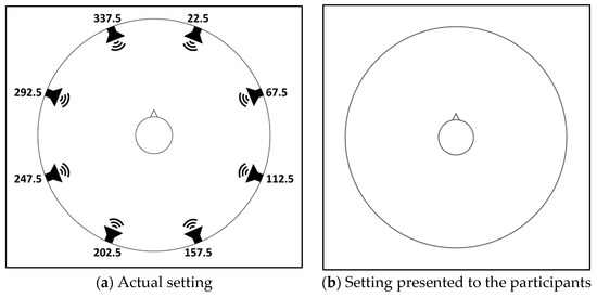 Experimental setting. The symbol in the middle represents participant orientation. (a) The actual setting: Participants sat in the middle of a circle of eight monitors separated by 45°, starting from 22.5° through 337.5°. (b) The setting presented to participants on a computer screen: participants were asked to indicate on the circle the location of the perceived sound source.