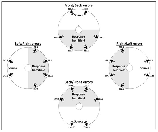 In environmental characteristics, one basic feature among many is the spatial angle from which an acoustic stimulus is delivered relative to the listener’s forehead or relative to another point of reference. In this study, we focused on acoustic stimuli presented in the horizontal plane, thus referring to horizontal positions (left, right, front, back, or any other azimuth) in reference to the forehead of a listener who is seated in the center and surrounded by equidistant sound sources. Studies have shown that the localization of stimuli delivered from the front, left, or right (relative to the forehead direction) is more accurate than those delivered from the back [5,6,7]. Confusing a right-delivered stimulus for a left one, or vice versa (termed here as right/left or left/right errors), reflects a difficulty in perceiving cues related to interaural differences. Confusing a front-delivered stimulus for a back one, or vice versa (termed here as front/back or back/front errors), reflects a difficulty in perceiving spectral cues, related to changes in the sound’s spectra due to the pinnae, head, and torso [5,6]. Spectral cues contribute less than interaural difference cues to localization [1,8], but the localization of sound sources from the front or the back is especially difficult when some spectral cues are unavailable, such as when the pinnae are covered by earphones [4,5,6,7,8,9]. Thus, when considering the ability to localize sound, one should consider the source’s azimuth in regard to the listener’s forehead direction. The localization can be evaluated either by specifying the sound source azimuth in units of degrees, or by a binary generalization of the sound source hemifield. The latter reflects whether a stimulus originating from one of the hemifields would be perceived correctly or incorrectly as originating from the opposite hemifield.