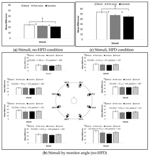 Mean RMSE of stimuli for (a) stimuli only (no-HPD condition), averaged across all 90 participants; (b) stimuli only (no-HPD condition) at each source angle, averaged across all 90 participants, including statistics for main effect for stimuli at each source angle; (c) stimuli only (HPD condition), averaged across HPDs for all 90 participants; and (d) stimuli and HPD at each source angle, averaged across 30 participants in each HPD group. * p < 0.05.