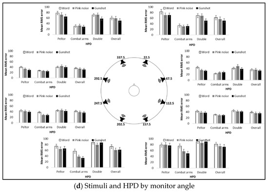 Main effects were found for stimulus type, source angle, and HPD type (F(2,174) = 29.082, p = 0.000, partial η2 = 0.251; F(2,174) = 40.580, p = 0.000, partial η2 = 0.318; and F(2,87) = 37.222, p = 0.000, partial η2 = 0.461, respectively). As was observed in the no-HPD results, the RMSE differed between all three stimuli: the word had the largest RMSE and gunshot the smallest (Figure 5c). The mean RMSE for each stimulus at each source angle under the HPD condition, and the overall average across HPDs, are presented in Figure 5d. Post hoc LSD test results between source angles are presented in Table 1b. Similar to the results for the no-HPD condition, the largest RMSEs were found for monitors in the back (157.5° and 202.5°), although the back-left monitor (202.5°) had a smaller RMSE than the back-right one (157.5°) and a similar RMSE to the front monitors (22.5° and 337.5°). Under the HPD condition, the smallest mean RMSEs were observed in the right and left monitors (67.5°, 112.5°, 247.5°, and 292.5°). Combat Arms™ 4.1 resulted in the smallest overall mean RMSE (compared to Peltor™ H515FB: LSD = −21.009, p = 0.000; and compared to double protection: LSD = −24.422, p = 0.000). Importantly, no difference in the overall mean RMSE was found between Peltor™ H515FB and double protection (LSD = 3.413, p = 0.269).