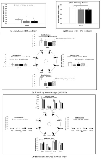 Significant interactions were found for Stimuli Type X HPD Type, Hemifield X HPD Type, Stimuli Type X Hemifield, and Stimuli X Hemifield X HPD Type (F(4,174) = 3.703, p = 0.006, partial η2 = 0.078; F(6,261) = 5.965, p < 0.001, partial η2 = 0.121; F(6,522) = 6.909, p < 0.001, partial η2 = 0.074; and F(14,522) = 4.568, p < 0.001, partial η2 = 0.095). Figure 6d presents the mean percent of mirror image reversal errors by each HPD for the different stimulus types. Separate repeated measures ANOVAs showed main effects for stimuli perceived while using different HPDs only for F/B and B/F errors, with main effects for stimuli perceived with all HPDs for B/F errors, and only with Peltor™ and double protection for F/B errors (Table 6b). The word stimulus had the largest percentage of errors: more F/B errors than for the gunshot when using the Peltor™ or double-protection HPDs, and more B/F errors than both pink noise and gunshot when using the Combat Arms™ HPD. Pink noise displayed more F/B hemifield errors than the gunshot stimulus when using double-HPD protection, but less B/F errors than the gunshot when using the Peltor™ or double-protection HPDs (Table 6b).