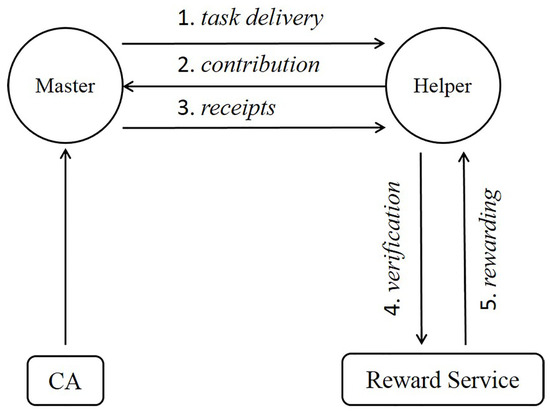Master () is an entity that creates a task on behalf of its owner or any external data consumer, disseminates the task, and collects the reports for the task. Helper () is an entity that receives a task from the Master, performs the task, and reports the results back to the Master. Reward Service () is the entity that verifies the contribution of an Helper and issues rewards to the Helper accordingly. Certificate Authority () is an authorized entity that issues certificates to entities and checks the validity of certificates if requested. The distinction between and is only logical separation, and and can be implemented in the same server.
