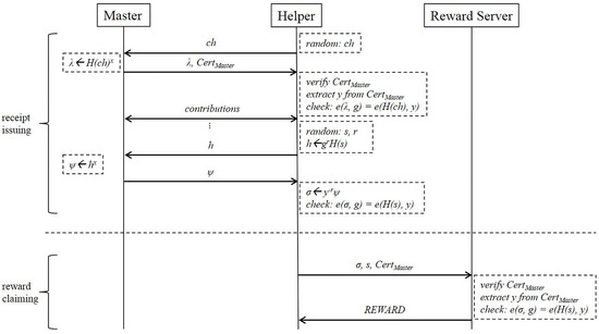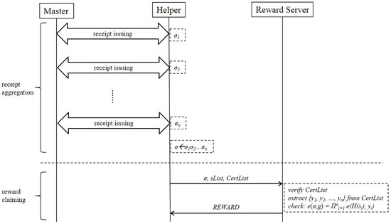 As shown in Figure 2, our reward scheme is used in the following way. A user, who acts as a Master, runs to obtain . The receipt-issuing key x is kept secret and the verification key y is certified by a in the form of digital certificate. The certificate issuing procedure is out of scope, but, for example, the Master will send a certificate signing request (CSR) message to the , and the will issue a certificate in return. The Helper can verify the Master’s identity by verifying the signature of on the certificate in order to prevent a malicious Master from tasking the Helper without rewards. When another user, who acts as a Helper, wants to get a receipt after contributing to the Master’s task, is executed jointly by Master running and Helper running . At the first time of the communication between the Master and the Helper, the Helper needs to authenticate the Master with a challenge . The Master signs on using x, and sends and to the Helper. Note that y can be extracted from . The fresh serial number s is usually chosen by Helper uniformly at random during the receipt-issuing process (i.e., s is essentially a random nonce) and the receipt is issued for the serial number s. To exchange a receipt for a reward, Helper sends a reward-requesting message to the Reward Serivce who can verify the authenticity of by checking whether of not. If is a valid receipt for an unused serial number s, sends a reward to Helper and adds s to the expiration list L.