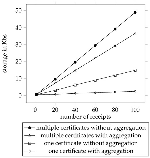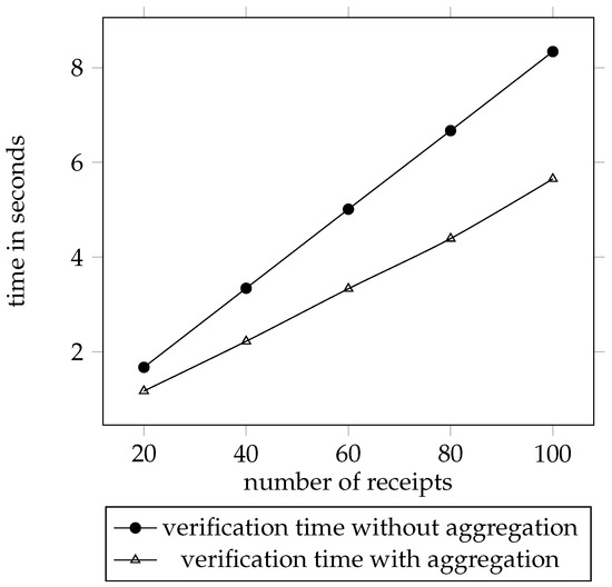 Receipt is the GDH signature of Boneh et al. [52,53]. A nice property of the GDH signature is that multiple signatures by distinct entities on distinct messages can be aggregated into a single signature [55]. Suppose Master for has receipt-issuing key and verification key . The aggregate of n receipts for can be computed as whose authenticity can be verified by .