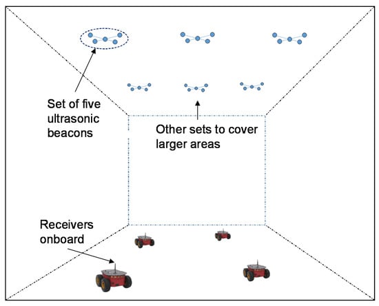 Figure 1. Deployment of ULPS for a wide coverage area using sets of five ultrasonic beacons.
