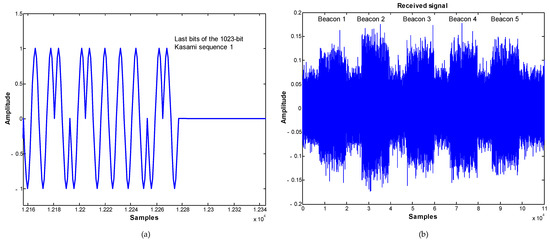 Figure 4. (a) BPSK-modulated carrier of a Kasami sequence with 1023 bits (last bits). (b) Received signal corresponding to the five beacons-multiplexed emissions in a noisy channel.
