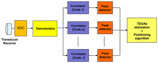 The arrival of each transmitter’s emission is obtained by the correlation between the received signal y[n] and the corresponding transmitted code cj, by detecting when a maximum correlation peak appears. Figure 5 shows a receiver block diagram.