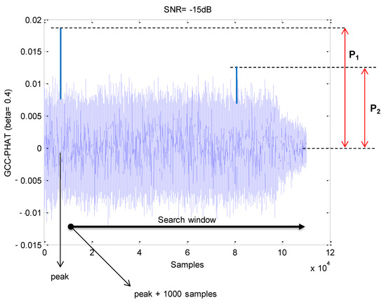Figure 6 shows an example of the GCC-PHAT between the received signal and the sequence corresponding to a beacon with simulated data. Please note that with the SNR = −15 dB selected, the main peak has an approximately double amplitude than the average of noise around, and thus it can be detected. The SPMP is estimated from the ratio P between the maximum P2 of the sidelobes outside the multipath zone (first 1000 samples around the main peak) and the main lobe P1 (P = P2/P1). Please note that the lower the value of P the better the SPMP ratio, including process noise.