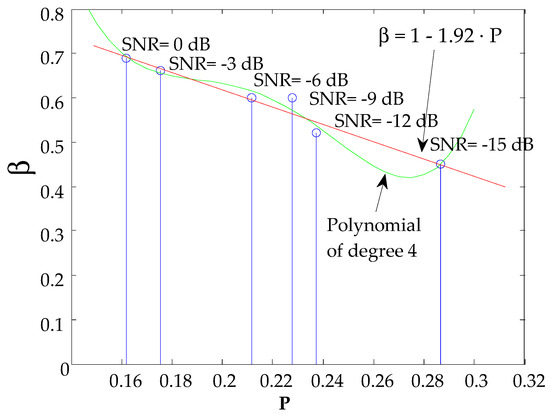 A range of SNR variation [−15 dB, −12 dB, −9 dB, −6 dB, −3 dB, 0 dB] has been considered in the simulated test. The reason to select these values is that in this range the value of β has influence: lower SNR can end up with problems to detect the main correlation peak and higher SNR can be computed with the non-pondered GCC, i.e., β = 1, as is shown further on. For each SNR, β has been modified between 0.4 and 1 in steps of 0.01, obtaining the value of β for which P is minimum. Figure 7 shows the results extracted from the test. It is represented in green a 4th order polynomial that best models the behavior of β. However, we have considered the linear approximation function (straight line in red) expressed in (9), due to its low computational cost and the fact that the differences of β using one or another approximation is typically much less than 0.05, what would have a negligible impact in real situations, where there can be other sources of noise (not only Gaussian), the model of multipath can be different, etc.: