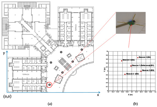 Figure 8. (a) Experimental placement of the ULPS to consider the global coordinates of the building map (the rest of ULPSs not marked have not been used in this experiment); (b) projections of the beacons on the floor plan (z = 0).