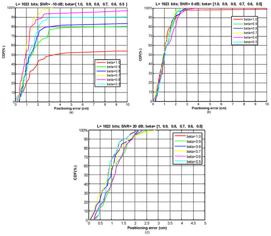 Figure 10. CDFs of ranging errors in 2D positioning applying the GCC-PHAT(β) at a far point. (a) SNR = −10 dB; (b) SNR = 0 dB; (c) SNR = 20 dB.