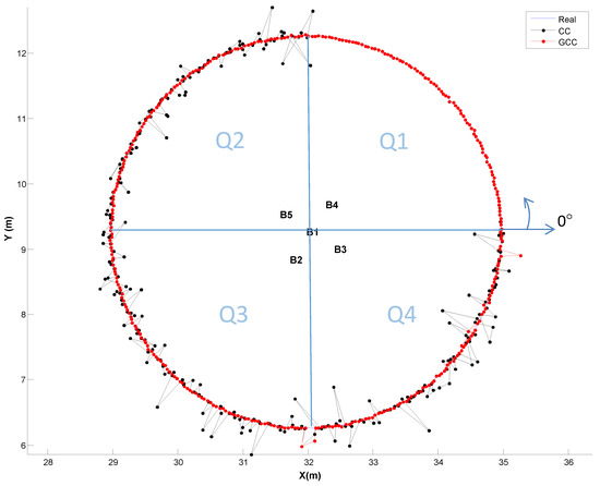 As the benefits of using GCC-PHAT(β) when the receiver is at a fixed position have already been described, the following subsection focuses on evaluating it when the receiver is continuously moving on a plane on the ground (coordinate z = 0). We have simulated a receiver following a circular path of 3 m radius, whose center is located at the projection on the plane z = 0 of beacon 1 (the reference beacon). We have divided the path into four equal parts of 90° (Q1-Q4), and for each one we have used a different SNR, with and without multipath effect. The features of each quadrant are as follows: Q1 (0–90°), SNR = −10 dB (without multipath); Q2 (90°–180°), SNR = 10 dB and multipath effect; Q3 (180°–270°), SNR = 0 dB and multipath effect; and Q4 (270°–360°), SNR = −10 dB and multipath effect. For analyzing the effect of the proposed GCC-PHAT(β), we compare the results with the CC. A set of 360 points has been evaluated along the path.