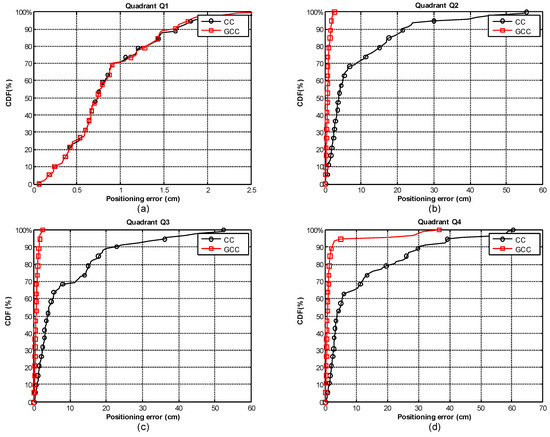Figure 12 shows in the first quadrant Q1, where in the absence of multipath, the behavior of GCC-PHAT(β) (in red) versus CC (in black) is very similar despite the low SNR (−10 dB), resulting in an error lower than 1.5 cm, with a confidence of 90% (Figure 13a). However, with the presence of multipath effect (quadrants Q2, Q3), we can visually appreciate in Figure 12 that the performance of GCC-PHAT(β) is better than CC.