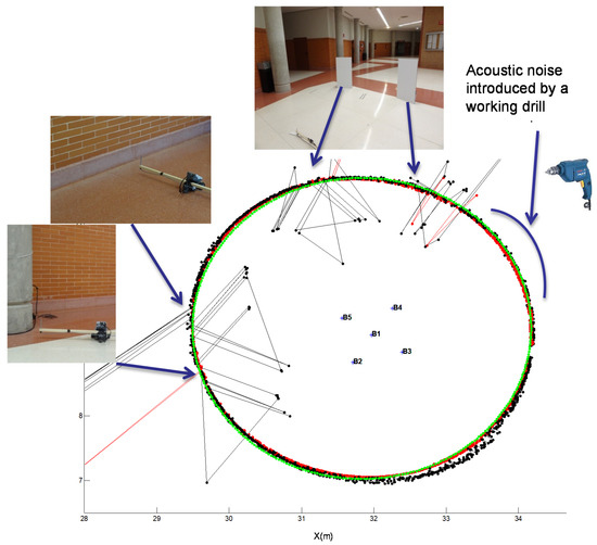 Figure 15. Circular path in the experimental environment with the designed ULPS. Real trajectory, in green; the estimated one using the GCC-PHAT(β) in red; and the estimated one using the CC in black. Different photos have been added with particular situations encountered by the receiver: high acoustic noise or multipath due to methacrylate plates, a wall or a column.