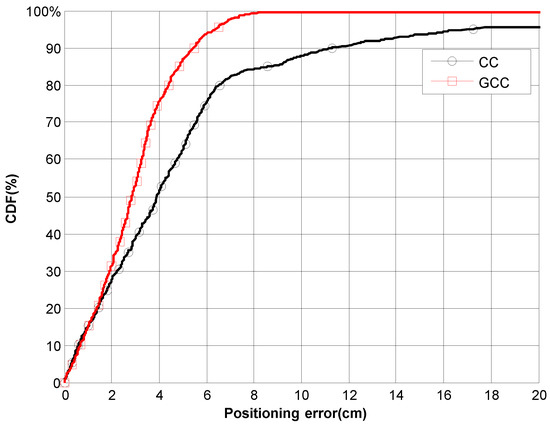 Figure 16. CDF of the ranging error in 2D positioning (CC vs. GCC-PHAT(β)) along the experimental path.