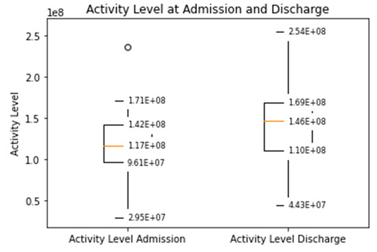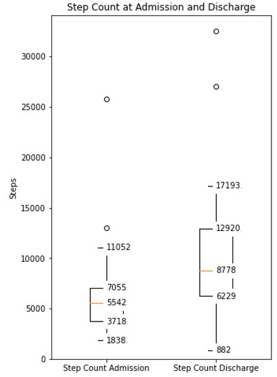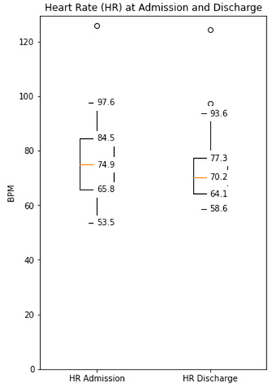 The distance covered during the 6MWT at the time of CR clinic admission significantly increased from a mean of 329 m (±107) to 470 m (±116) at the time of discharge (p < 0.0001, Supplementary Figure S1). The median daily step count as assessed by the WCD’s accelerometer significantly increased from 5542 (IQR 3718–7055) on the day of admission to a median of 8778 (IQR 6229–12,920, p < 0.0001) on the day of discharge (Figure 1). Similarly, the activity level significantly increased from a median 117 × 106 (IQR 96 × 106–142 × 106) TVE on the day of admission to 146 × 106 (110 × 106–169 × 106), p < 0.0001) TVE on the day of discharge (Figure 2). The median heart rate numerically decreased from 74.9 bpm (IQR 65.8–84.5) on the day of admission to 70.2 (IQR 64.1–77.3, p = 0.09) on the days of discharge (Figure 3).