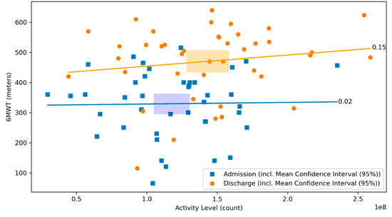 Scatterplot of 6MWT and activity level at admission and discharge with respective correlation coefficients. The relationship between the 6MWT and the activity level at admission (blue) and discharge (orange) of the CR stay are illustrated. The graph visualizes their respective correlation coefficients. Blue dots represent patients at admission, whereas orange dots represent patients at discharge. The lines depict the correlation coefficient between the 6MWT and the activity level at admission in blue and at discharge in orange. The rectangles represent the mean confidence intervals of the respective means (r = 0.02, p = 0.90 and r = 0.15, p = 0.35, respectively).