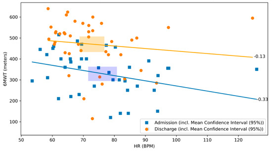 Scatterplot of 6MWT and heart rate at admission and discharge with respective correlation coefficients. The relationship between the 6MWT and the heart rate at admission (blue) and discharge (orange) of the CR stay are illustrated. The graph visualizes their respective correlation coefficients. Blue dots represent patients at admission, whereas orange dots represent patients at discharge. The lines depict the correlation coefficient between the 6MWT and the heart rate at admission in blue and at discharge in orange. The rectangles represent the mean confidence intervals of the respective means (r = −0.33, p = 0.03 and r = −0.13, p = 0.41, respectively).